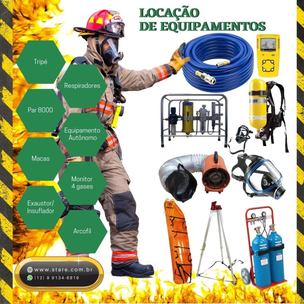 Locação de Equipamentos Além dos treinamentos, a empresa disponibiliza equipamentos para locação, principalmente para atividades que envolvem a NR 33, como tripés de resgate e outros equipamentos para trabalho em espaços confinados.